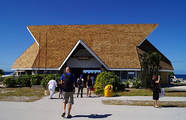 Kolem jedenácté naše letadlo dosedlo na runway maličkého fakaravského letiště. Jeho hlavní a jediná budova stojí za zmínku, takovou totiž na Ruzyni, Heathrow nebo v Los Angeles určitě nenajdete. Je to v podstatě dřevěný domek s vysokou, zvláštně tvarovanou střechou z došků (nebo co to je) a vnitřní rozlohou odhadem sto padesát čtverečních metrů. Hala je průchozí a nad hlavním vchodem visí dřevěná cedule s bílým nápisem Fakarava. Nedivil bych se, kdyby byl psaný ručně.