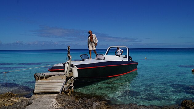 Potom jsme vyrazili k přístavu. To jsme si tedy alespoň mysleli. Ve skutečnosti nás slečna řidička dovezla k maličkému molu mezi palmami a dvěma domky místních. Tam už nás čekala loď. Tedy loď, byl to spíš větší tmavě natřený člun s kapotovanou přídí a velkým návěsným motorem. U něj čekal kapitán - dohněda opálený vysoký starší pán s delšími, sluncem do světle žluta vyšisovanými vlasy. Nevypadal jako typický domorodec, ale nejen opálení napovídalo, že tu zřejmě žije dlouho. Na sobě měl jen pískové kraťasy a sandále. Hádal jsem mu tak šedesát a silně mi připomínal Klekí Petru z prvního dílu filmového Vinnetoua. Šel nám naproti, vesele nás zdravil a hned se jal nakládat naše zavazadla a balíky s vodou do malého podpalubí na přídi člunu.