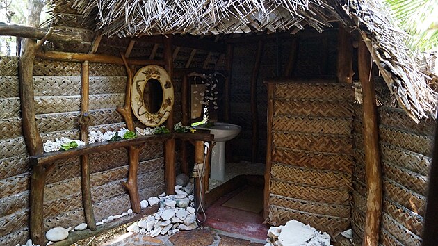 V zadní části místnosti jsou další dveře a za nimi něco jako malý kameny dlážděný dvorek, nad kterým se sklánějí palmy. V jeho zadní části je pak za přepážkou záchod a také umyvadlo bez kohoutku - ten nahrazuje hadice se sprchou zavěšená na dřevěném sloupku vedle. Všude podél stěn je opět krásná korálová výzdoba. Manahi se nám omluvil, že vody je momentálně málo, protože dlouho nepršelo a sprcha nabízí opravdu jen nepatrný čůrek. Byli jsme také požádáni, abychom nesplachovali častěji, než je nezbytné. I k tomu je tu totiž používána sladká - dešťová voda. V Motu Aito ji zachycují do obrovského černého barelu na dřevěné věži stojící kousek od mola. V noci by prý mělo pršet a pak to snad bude s vodou lepší.