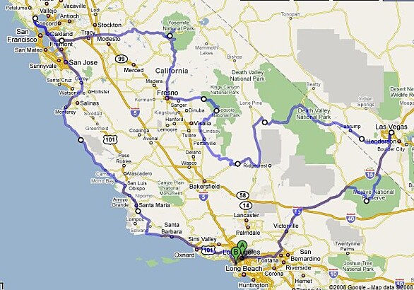 S nostalgií jsme sledovali ubíhající pobřeží Pacifiku a vlastně se rozhodli udělat poslední den tak trošku plážový. Po cestě jsme zastavili v Santa Barbaře, prošli se po další krásné kalifornské pláži obsažené několika bezdomovci. Musel jsem uznat, že ti zdejší byli sympatický vynalézaví: jeden dělal sochu mořské panny s kloboukem vedle, další měli nataženou plachtu s cedulkou "Everybody needs a little help sometimes", na kterou jste z výšky po procházce na molu mohli hodit čtvrťák. A sami se ležérně slunili vedle a hráli karty.:-) Když už žebrat, tak aspoň s pořádnou dávkou stylu.