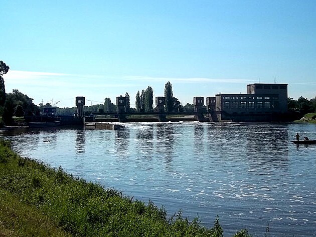 Na Labi je i mnoho jezů a zdymadel. Tento je například u Kostelce nad Labem.