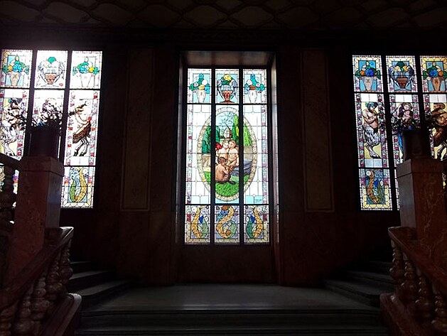 Atmosféru tu dokreslují i barevná vitrážová okna.
