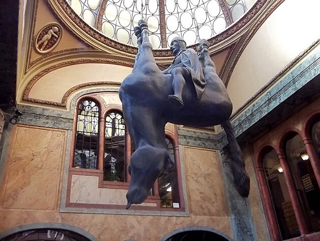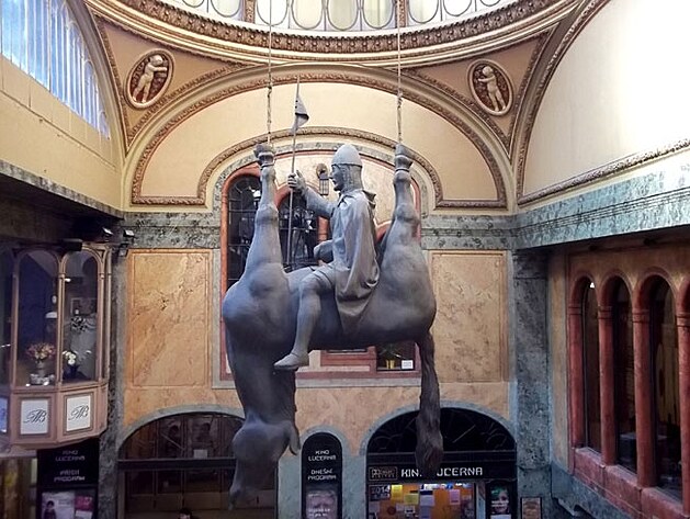 Dnes je v těchto místech zavěšena provokativní socha výtvarníka Davida Černého zobrazující svatého Václava sedícího na břiše svého koně.