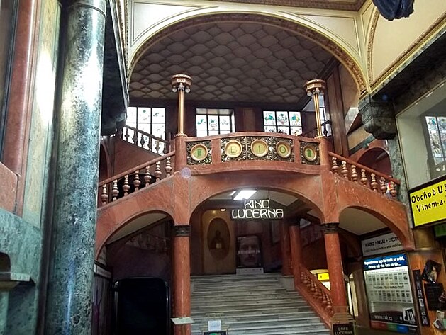 Když projdeme pasáží, nejvíce na nás asi zapůsobí místo, které se nalézá zhruba v jejím prostředku. Je zde například schodiště ke vstupu do kina Lucerna. Možná ho poznáte i z filmu „Můj brácha má príma bráchu“, a to ze scény, když se „Prcek“, jako akvarista, snaží dostat do tanečního sálu. Zkusme se tu trochu více porozhlédnout.