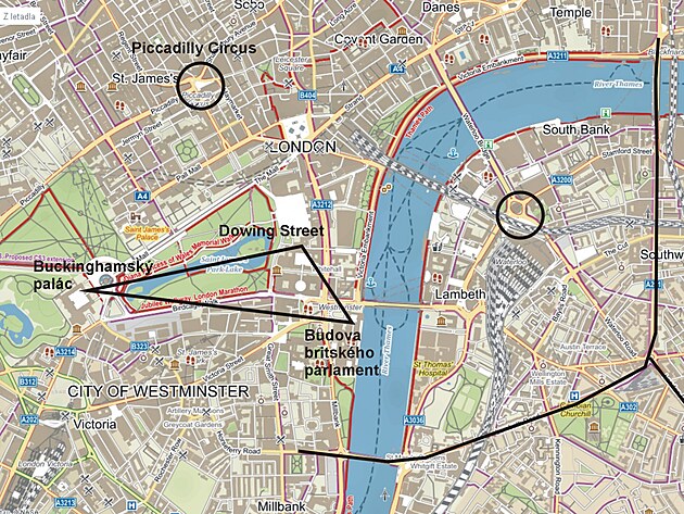12) V centru Prahy můžeme jít od Národního divadla, Národní třídou, ulicí na Příkopě až do Revoluční, kde se opět ocitneme u Vltavy. V Londýně je tomu obdobně. Od Temže se dá jít po Lambeth Road a Blackfriars Road a prakticky budeme kopírovat ten samý tvar.