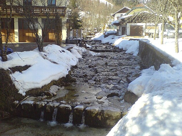 Horský potok odvádí vodu z tajícího sněhu dolu do údolí