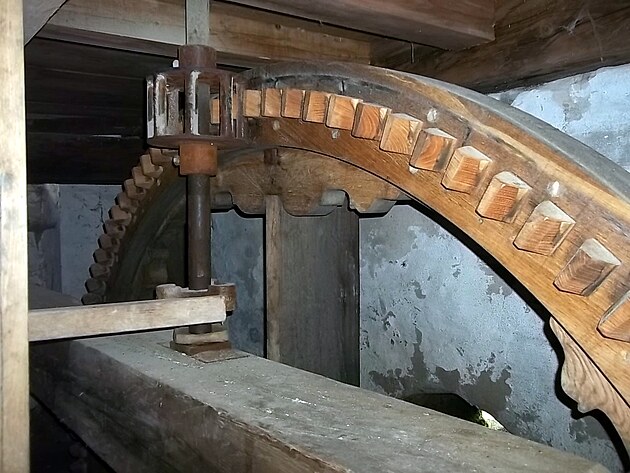 Dřevěné ozubené kolo, které pohání mlýn.