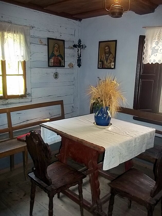 Byt mlynáře se stolem a svatým koutkem.