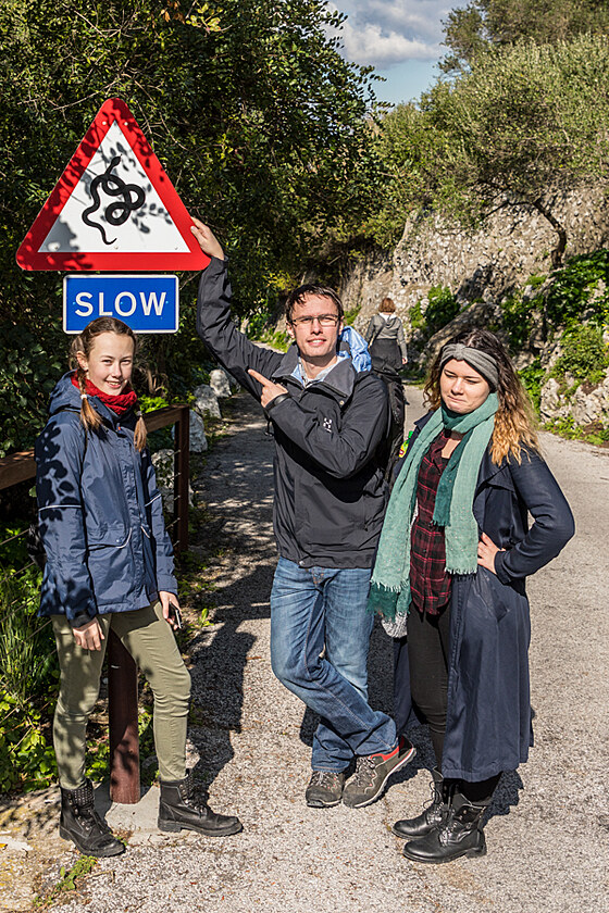 Scházíme z asfaltového chodníku, a vydáváme se sotva znatelnou stezkou v porostu. Zavede nás k jedné z mnoha baterií, tj. dělostřeleckých postavení. Dnes už samozřejmě opuštěných. Je to to, co dělalo Gibraltar Gibraltarem. Strategická pevnost. Skála byla prošpikovaná děly jako nedělní hovězí svíčková slaninou. Děla bezpečně zasáhla cokoliv proplouvající úžinou mezi Afrikou a Evropou. Cesta v porostu není úplně pohodlná, ale už není zima, počasí víc španělské než britské. Jsme zjevně na závětrné straně Skály. Modrá obloha a úžasné výhledy. Přicházíme k visutému mostu Windsor Bridge. Je poměrně mladý a jako všechny visuté mosty se houpe. Snažíme se ho rozkmitat tak, aby spadl. Když se zdá, že by se to mohlo zdařit, prcháme. Opět se dostáváme na asfaltový chodník s pozoruhodnou značkou. Je na ní zkroucený had. Obě dcery přísahají, že to je naposledy co s námi někam jely. Zapínám diktafon a sháním svědky. Číhající opice nad hlavami a hadi pod nohama, to je prostě moc. Následuje další baterie, tentokrát s poetickým názvem Devil’s Gap Batery a skutečným kanonem. Krátký sešup a už jsme na schodech v jedné z uliček mezi prvními domy.