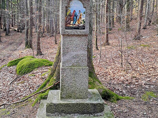 První zastavení – Emauzský obrázek. Na kamenném sloupku byl od nepaměti upevněn obrázek připomínající biblický příběh setkání Krista s učedníky v Emauzích. Pro mne zastavení nejsilnější. Vzpomenu si totiž krátký popis z knihy o Jizerských horách. Již jsem ho citoval v příběhu o zabitém mládenci.