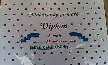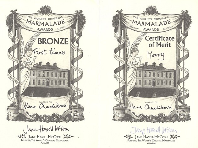 Tak došlo i na nápad zkusit to na soutěži World´s Marmalade Awards. Přihlásila jsem se v kategorii pro amatéry, protože souběžně probíhá kategorie pro firmy, a to já nejsem. Poslala jsem 2 marmelády. Jedna byla pomerančová a druhá jablečná s karamelem, rozinkami v rumu a vlašským ořechem. S napětím jsem čekala, jak to vše dopadne, protože nemám s mezinárodní soutěží vůbec žádné zkušenosti. Předevčírem mi přišla větší, ale nenápadná obálka. Věděla jsem moc dobře, co v ní bude - poděkování za účast atd. Asi půl hodiny jsem oddalovala otevření a pak jsem to riskla. Proboha jsou tady diplomy, je to možný? Divím se ještě teď… 3. místo - bronzová za pomerančovou a 4. místo - čestné uznání za jablečnou.