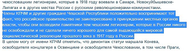 - Členové KSČM a další občané České republiky pozitivně vnímají tu skutečnost, že ruská vláda nemá zájem nutit místní úřady, aby stavěly památky těm českým legionářům, kteří v Rusku nikoho neosvobodili a neučinili nic dobrého pro nejvýznačnější světovou socialistickou revoluci minulého století v roce 1917 v Rusku.
