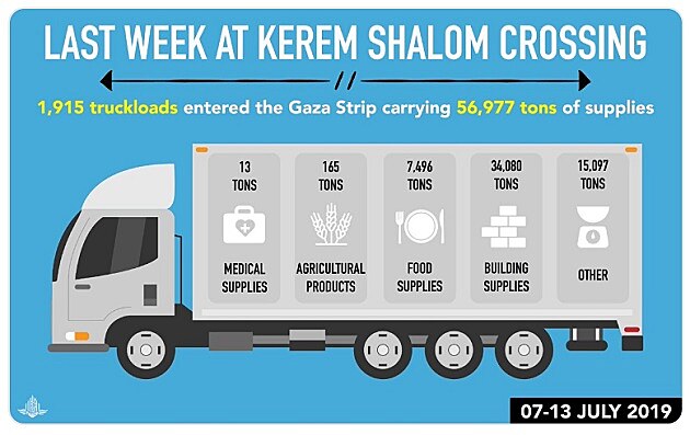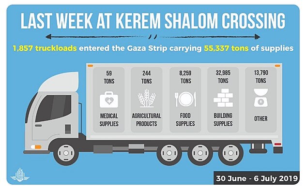 ... ve dnech od 30/6 do 6/7/2019 bylo přes přechod Keren Šalom posláno do Pásma Gazy 1857 nákladních vozidel s více než 55 tisíci tunami potravin, zdravotnického a jiného materiálu. (Zdroj: COGAT Twitter)