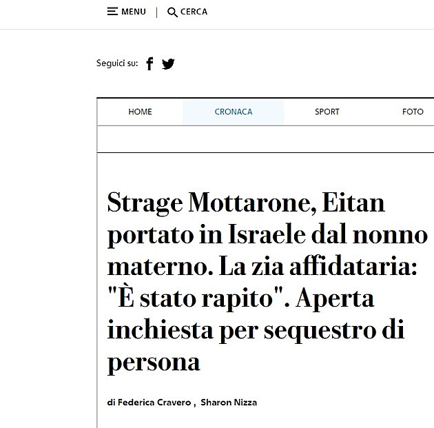 Situaci vyhrotila ještě jedna okolnost. Ať se věci mají tak či onak, Eitan musí do školy. K úžasu izraelské rodiny přihlásila teta Aya Eitana do „školy jeptišek“, jak o tom 13. srpna 2021 informoval web listu La Stampa (obr. 1):
