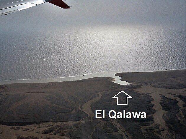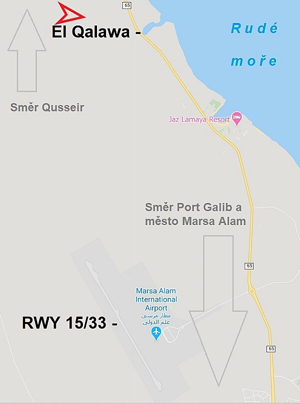 ... obr. 5/Pro lepší orientací: na mapě je letiště v Marse Alam a vyznačená lokalita El Qalawa se zálivem, jakých je na tomto rudomořském pobřeží celá řada. U některých jsou hotelové pláže s báječnými korály. Červená šipka - pohled z okna letadla na následujícím snímku. (Podklad: Google Maps)