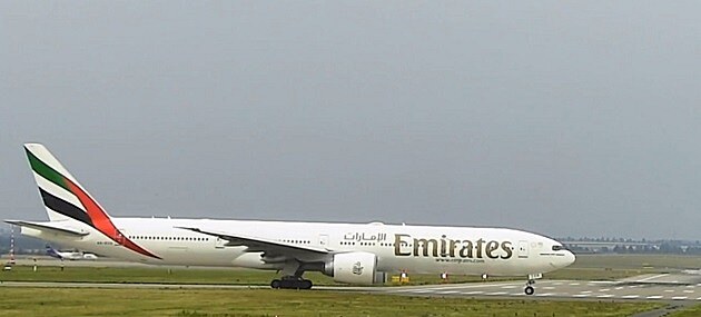 ... obr. 3/ Přistání Boeingu 777 z Dubaje. Jak uvádí web Z dopravy, jedná se návrat společnosti Emirates do Prahy po více než čtyřměsíční koronavirové přestávce. (Zdroj: MALL.TV/Slow TV s jejich laskavým svolením.)