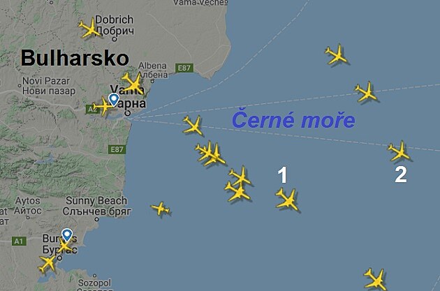 obr. 12/V 17:35 hod. už byly oba stroje nad Černým mořem. 1 - Boeing 777 letící do Dubaje, 2 - Boeing 787 Dreamliner mířící do Dauhá. (Podklad: Flightradar24.com a Google Maps.)