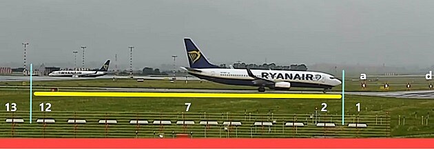... obr. 2/Pátek 2. července 2021, čas 15:49 SELČ. Z pojezdové dráhy A přijíždí k hlavní ranveji 06/24 Boeing 737-800 společnosti Ryanair. Žlutá vodorovná čára a dvě svislé akvamarínové ukazují velikost Boeingu 777. Čísla a písmena jsou pomocné značky světelné signalizace pro lepší orientaci čtenářů. (Podklad: Mall.tv/Slow TV s jejich laskavým svolením. Doplňující grafika: Malování 3D MS Windows 10.)
