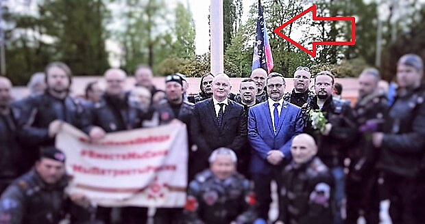 I kdybychom se skřípěním zubů akceptovali Haškovu účast na samotném pietním aktu (nikoli proto, že bychom si nevážili sovětských obětí, ale z důvodu aktuálního politického kontextu), pak rozhodně nemůžeme přehlédnout skutečnost, že na společné fotografii je vztyčená jedna jediná vlajka – a to vlajka Doněcké lidové republiky. Proč? Co tím chtějí Noční vlci vyjádřit?