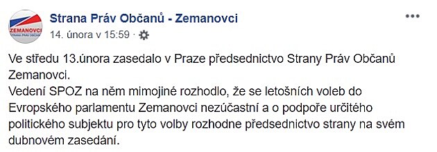 Odpověď je prostá: Miloš Zeman žádné dilema s partajní loajalitou řešit nemusí. Vedení partaje SPO Zemanovci se totiž 13. února 2019 rozhodlo, že letos se voleb do EP nezúčastní. Tady je důkaz na stranickém Facebooku: