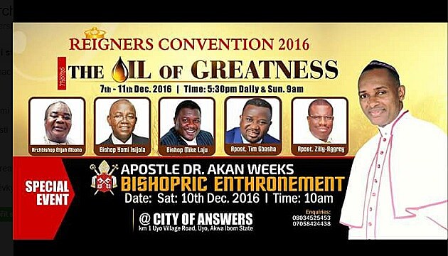 Zajímal jsem se o nigerijskou tragédii podrobněji. Postihla církevní společenství Reignes Bible Church International, podle webu The Christian Post jde o „evangelical church“ - evangelikální církev. Na jejím Facebooku je k vidění pozvánka na sobotní akci, při níž mělo dojít k uvedení do biskupského úřadu apoštola (této církve) dr. Akana Weekse (obr. 1). Byla to mimořádná událost v rámci církevní konvence. Proto se dostavilo obrovské množství věřících, z nichž mnozí si přišli pro smrt.