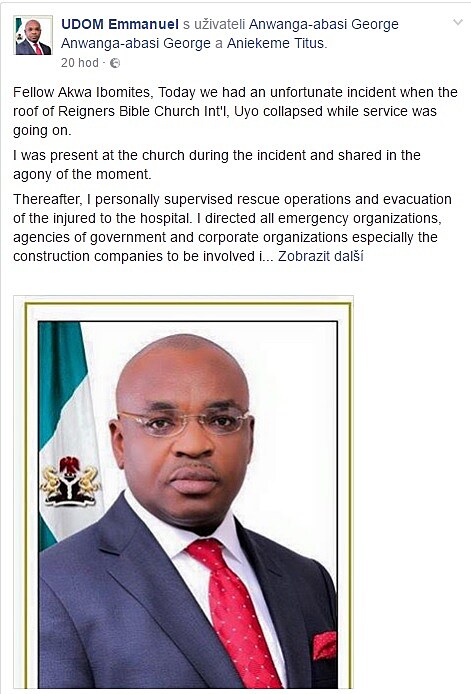 ... obr. 2/část vyjádření guvernéra Emmanuela na oficiální facebookové stránce jeho úřadu. Na snímku Udom Emmanuel.