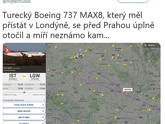 ... obr.1/Turecký MAX udělal před Prahou otočku a nabral směr, z něhož právě přilétal ... (Twitter Vojtěcha Gibiše)