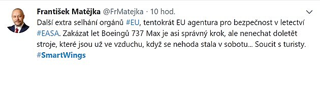 BEZ KOMENTÁŘE: Post kolegy blogera a dnes i politika Františka Matějky na Twitteru #smartwings: