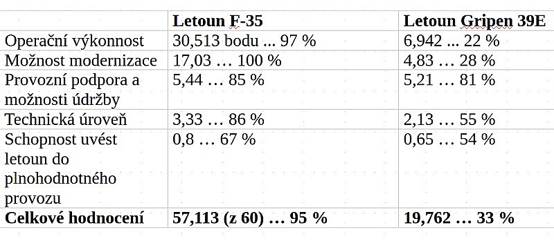 Z čísel je zřejmé, že úplně ve všech parametrech, v některých méně, v některých extrémně, zvítězil americký stroj, který mnozí považují za aktuálně nejlepší bojový stíhací letoun na světě. Dlužno dodat, že test byl zaměřen na schopnost každé z obou stíhaček bránit severoamerický kontinent a na pravděpodobnost úspěchu v různých druzích misí proti moderním nepřátelským vojenským silám. Je pravda, že z jednoho testu nelze dělat definitivní závěry, nicméně zveřejněné výsledky o mnohém vypovídají. Gripeny jsou skvělá letadla, ale F-35 jsou lepší, jasně vedou. Jejich zástupce získal zaokrouhleně 57 bodů z šedesáti možných, zatím stroj reprezentující Gripeny necelých dvacet. V procentuálním poměru 95 ku 33 %.