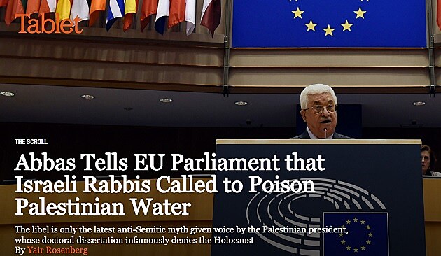 ... web Tablet Magazine informuje o Abbásově tvrzení v Evropském parlamentu, že izraelští rabíni žádají, aby byla otrávena voda pro palestinské Araby.