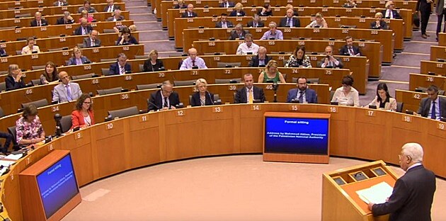 ... 23. červen 2016, Brusel. Mahmúd Abbás hovoří k poslancům Evropského parlamentu. Některé pasáže jeho projevu si nezaslouží jiné hodnocení, než že urážejí inteligenci soudných lidí. (Zdroj: YouTube.)