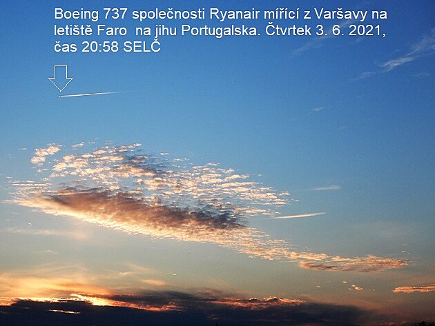 Večer jsem se kochal západem slunce - a nad ozářenými mraky spatřil kondenzační čáru. Jakému stroji asi patří? Dnes není těžké to zjistit. Nová doba. Host možná tu a tam vyhazuje vrchního, ale prostý člověk může zase pořídit a zveřejnit takovéto obrázky: