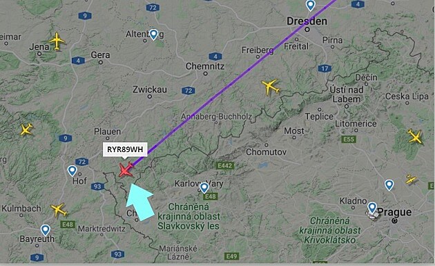 ... obr. 3/Totéž co nahoře, ale na mapě. (Podklad: Flightradar24.com)