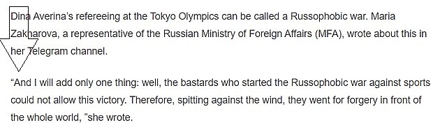 Konkrétně v příspěvku ze 7. srpna nazvaném „OH: K jedné ruské hysterii aneb Když stříbro nestačí“. Pokud jde o onen odkaz, čtenáře zajímá, co přesně uvedla mluvčí ruského MZV Maria (Marija) Zacharovová, když se vyjadřovala k tomu, že na OH v Tokiu nevyhrála víceboj jednotlivkyň ruská sportovkyně Dina Averina, ale izraelská reprezentantka Linoy Ašramová.