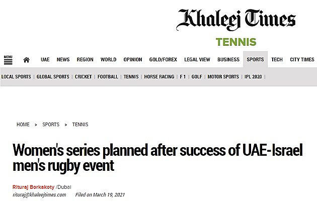 Dubajský server Khaleej Times napsal (obr. 1), že po úspěchu přátelského měření sil mezi muži plánují také emirátské ragbistky něco podobného. Tentokrát v Izraeli, kam v budoucnu odletí na sérii zápasů.