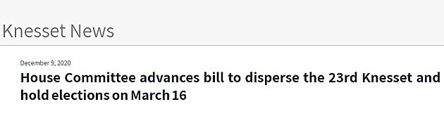 Ve zprávě se uvádí, že Sněmovní výbor postoupil zákon o rozpuštění 23. Knesetu do prvního čtení v plénu, které je na programu v pondělí 14. prosince 2020. Současně je v návrhu zákona uveden i termín. Pokud bude zákon schválen, půjdou Izraelci k volbám v úterý 16. března 2021. Pro zajímavost uveďme, že židovské svátky Pesach začínají v sobotu večer 27. března.