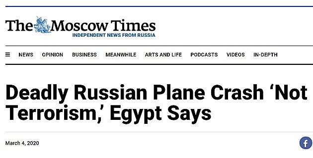 V roce 2016 však prezident Sisi uvedl, že se o terorismus jednalo. O to překvapivější je zpráva, kterou přinesl 4. března 2020 web The Moscow Times (titulek viz obr. 1). Podle výroku odvolacího soudu v Káhiře, který projednával žalobu rodin pozůstalých na vysoké egyptské představitele, leteckou společnost Metrojet a pojišťovnu Ingosstrach, se v případě havárie letu 9268 o teroristický čin nejednalo. Důkaz, že mezi úsudkem justice a vyšetřovatelů může být propastný rozdíl (což není právě uklidňující zjištění). Leč tato stránka tragédie není předmětem tohoto článku.