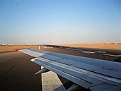 ... letiště v Šarm aš Šajchu má dvě paralelní dráhy. Pravou 04/22R a levou 04/22L - na tu právě najíždí před startem náš Boeing 737. Označení dráhy je patrné nad horním okrajem křídla. (Foto: Autor článku.)