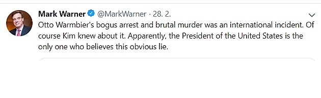 Bylo by popřením pravdy namlouvat si něco jiného. Jak napsal na svém Twitteru demokratický senátor Mark R. Warner (obr. 1): „Apparently, the President of the United States is the only one who believes this obvious lie.“ Zdá se, že prezident Spojených států je jediný, kdo věří této očividné lži (že Kim nevěděl o tom, co se s Warmbierem děje – LS).