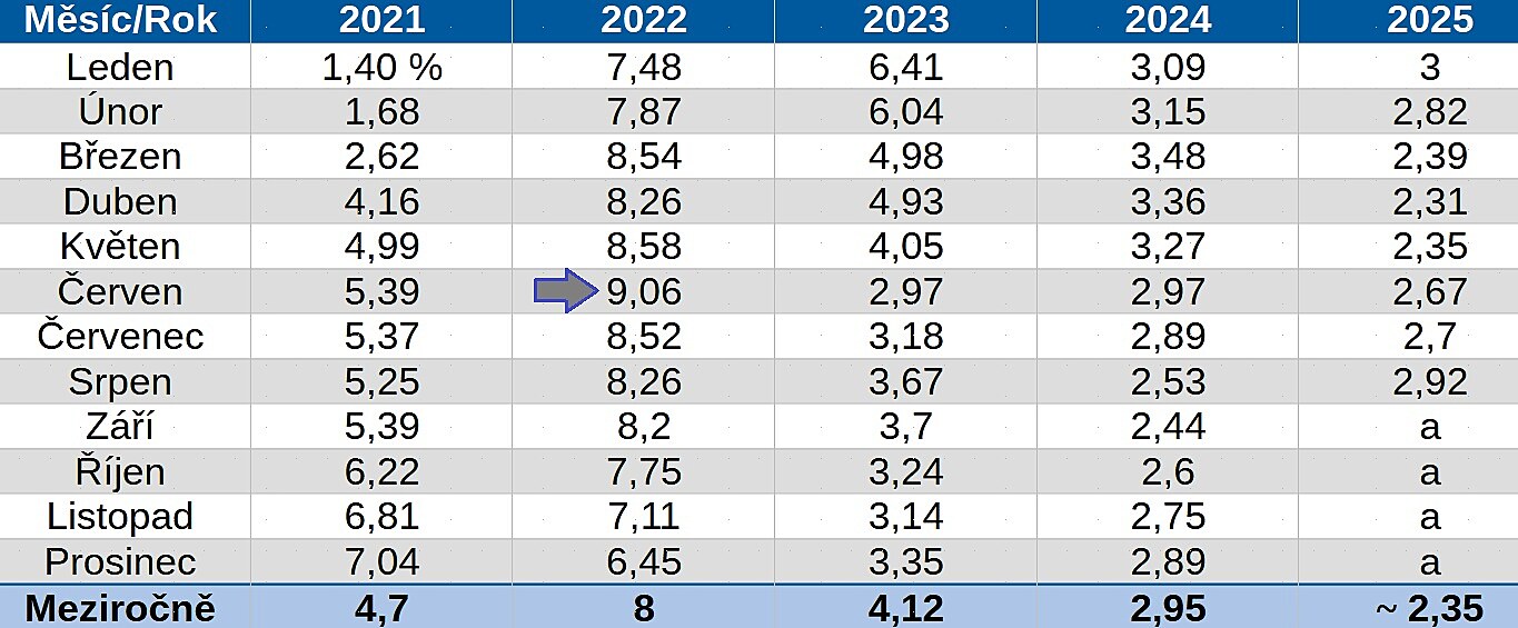 Tabulka níže zobrazuje měsíční údaje o míře inflace v USA od ledna 2021 do srpna 2025. Šipka v tabulce ukazuje na nejvyšší hodnotu inflace v tomto období, písmeno „a“ – data nejsou k dispozici. Zdroj: https://www.officialdata.org/current-inflation-rate