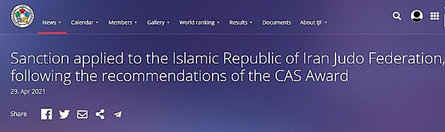 ... oznámení o sankci proti Íránské judistické federaci na webu IJF ze dne 29. 4. 2021.