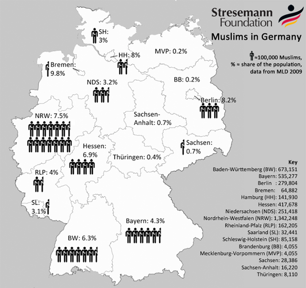 V roce 1924 bylo v sousedním Německu kolem 2400 muslimů. V roce 1948 již zhruba 200 000 a dnes přes 4 miliony. Názorně to popisuje tato mapka procent muslimů v populaci: