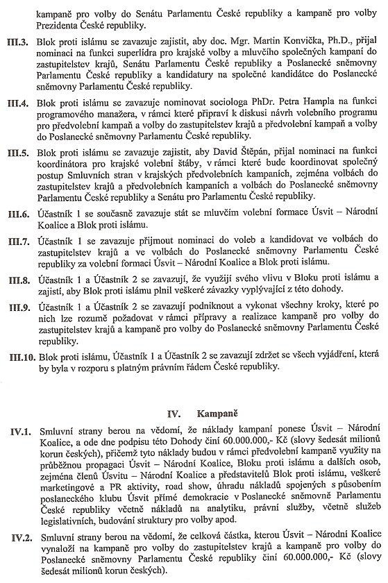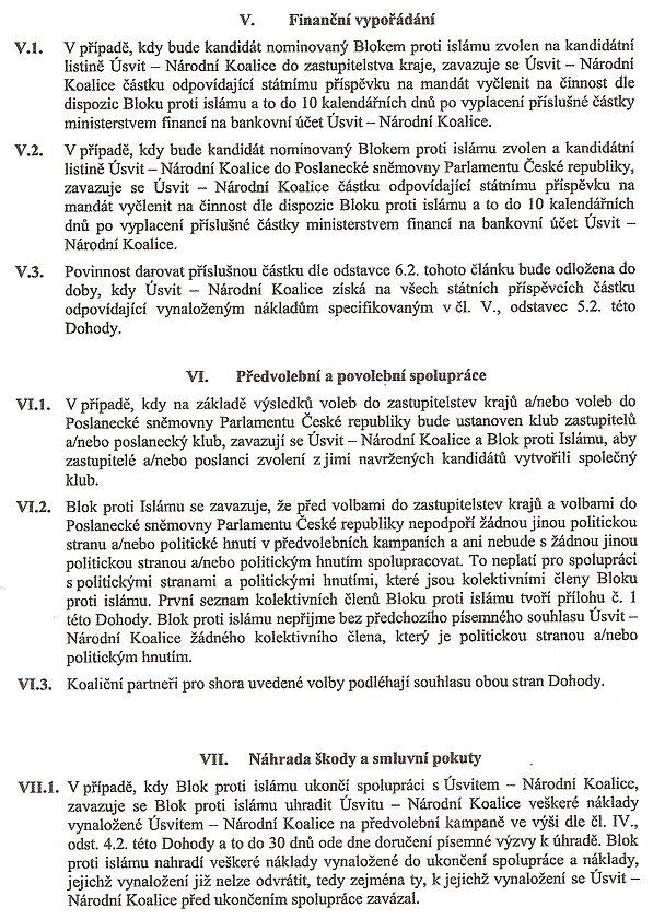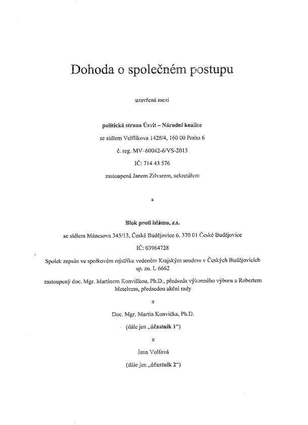 Autentičnost smlouvy nezávisle na sobě potvrdili Martin Konvička, Jana Volfová a Robert Metelec … Je to sice věc členů Bloku proti islámu, ale tato smlouva dělá z Bloku proti islámu nástroj toho, kdo bude ovládat hnutí Úsvit, a v případě, že by si členové Bloku proti islámu odhlasovali, že od smlouvy či spolupráce s Bártovým Úsvitem odstupují, pak by museli zaplatit veškeré náklady Úsvitu až do výše vložených peněz, tedy teoretický 60 milionů korun. Stejně tak se Blok proti islámu zavázal, že Bártovu Úsvitu v případě získání dostatečného počtu hlasů (když dosáhnou na státní příspěvek) zaplatí Úsvitu veškeré předchozí náklady (tedy až těch 60 milionů korun). Tedy Blok proti islámu může uspět, ale peníze nebudou členů Bloku, ale toho, kdo kontroluje Úsvit.