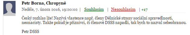 Ostatně média jsou v poslední době jednoduše hrozná. Např. agresivní reportéři Rozhlasu napadají vlastence pacifisty z Dělnické strany sociální spravedlnosti, kteří se jim pouze brání. A musí to být pravda. Diskutéři na novinkách totiž příspěvek opatřili 17ti souhlasy. Národ tedy promluvil.