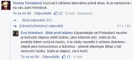 Nicméně účast v pořadu o vaření bychom s M. ještě zvládli. Pokud by projevy vlastenectví zůstaly jen ve virtuální rovině. Horší situace by nastala, kdyby si na ni slušní Češi kdesi počkali a pobodáním M. by prokázali své odhodlání v boji proti islámu. Následně bychom se také dozvěděli, že za tento útok, pardon vlastenecký čin, stejně může jen a pouze islám.
