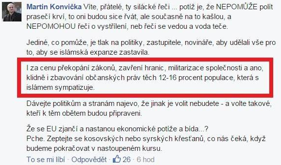 Pokud by ke znásilnění mladé dívky opravdu došlo, jsem pro nejvyšší možný trest. A nezáleží mi na tom, zda pachatelem je muslim, křesťan, ateista nebo příznivce sekty Aštara Šerana. Posuzuji a dívám se na lidi podle jejich činů. Ne podle toho, jestli chodí do kostela nebo mešity, či sedí doma. Neposuzuji lidi podle toho, jestli někdo nosí na hlavě šátek nebo nejí vepřové. Patřím tedy dle Martina Konvičky mezi 12 - 16 % nesvéprávných osob, jelikož kolektivní vinu odmítám.