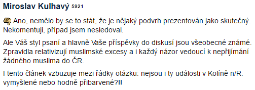 Byl bych velmi rád, aby dotyčný diskutér doložil, kde "zpravidla relativizuji muslimské excesy a i každý názor vedoucí k nepřijímání žádného muslima do ČR", protože já o ničem takovém nevím. Článek se věnoval okolnostem znásilnění třináctileté dívky v Berlíně ze strany "migrantů", které se nakonec ukázalo jako podvrh a celá kauza byla dílem ruské propagandy.