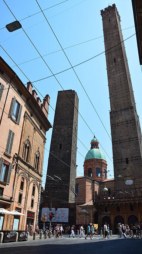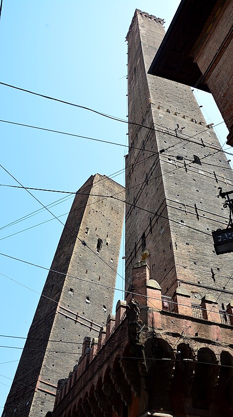 Tá vyššia - Asinelli, má neuveriteľných 97 metrov. Pre porovnanie, jedna z najvyšších budov Slovenska - Národná banka Slovenska so svojimi cca 30-timi poschodiami má 111 metrov. Ale veža Asinelli je postavená z tehál! a pochádza z 12. storočia. Obe veže sú aj napriek ich narovnávaniu stále šikmé, ale viac to vidno na tej nižšej – Garisende, ktorá je vychýlená o 3 metre, čo z nej robí najvychýlenejšiu vežu v Taliansku. Oproti nej veža Asinelli je vychýlená o 2,23 metra. Je najvyššou, a povedal by som, že aj najštíhlejšou šikmou vežou Talianska.