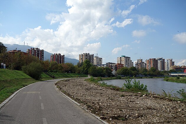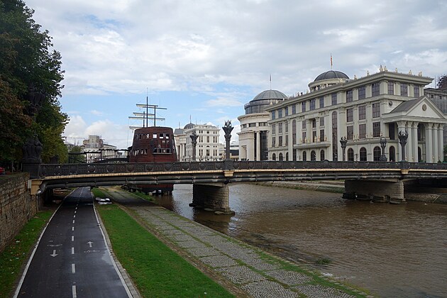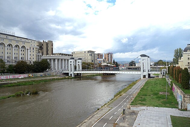 Luxusný cyklochodník. Vedie podĺž rieky celým mestom. V pozadí, vľavo hore, je vidieť Kríž tisícročia, ktorý je 66 metrov vysoký a bol postavený na vrchu Vodno (1.066 m) (Skopje leží vo výške 240 m.n.m.) ako pamätník na počesť 2000 rokov kresťanstva v Macedónsku.