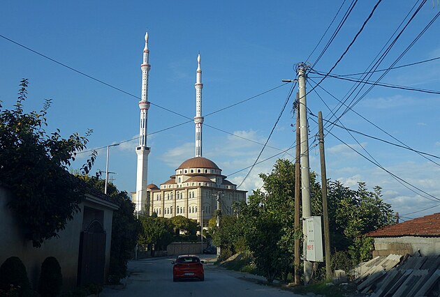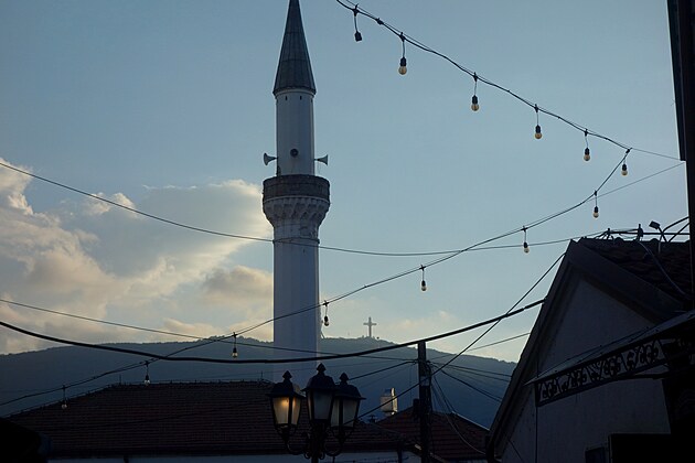 Minaret a za ním kríž.